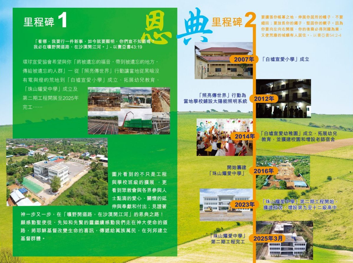2023 年,我們慶祝了 珠山耀愛中學 校舍的落成。神大大賜福,如今已有超過 150 位學生在這裡學習與成長。我們預期到了 2026 年,課室使用量將達至飽和,加上隨著高中及生活技能課程即將推出,對新設施的需求變得更加迫切。高中校舍已於 2024 年年中動工,靠著神的恩典,以及您們的同心支持,現已接近完工。我們將於 2026 年 11 月 26 日舉行奉獻典禮,將這座新校舍獻給主,盼望它能夠服事一代又一代的初高中生,裝備他們以知識和技能來影響社區。
